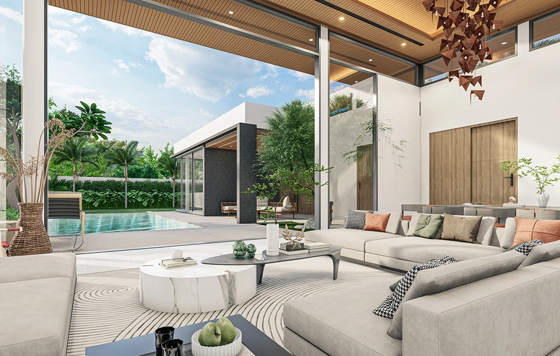 开放式设计的客厅和餐厅通往泳池露台,为户外休闲创造了理想的条件。
