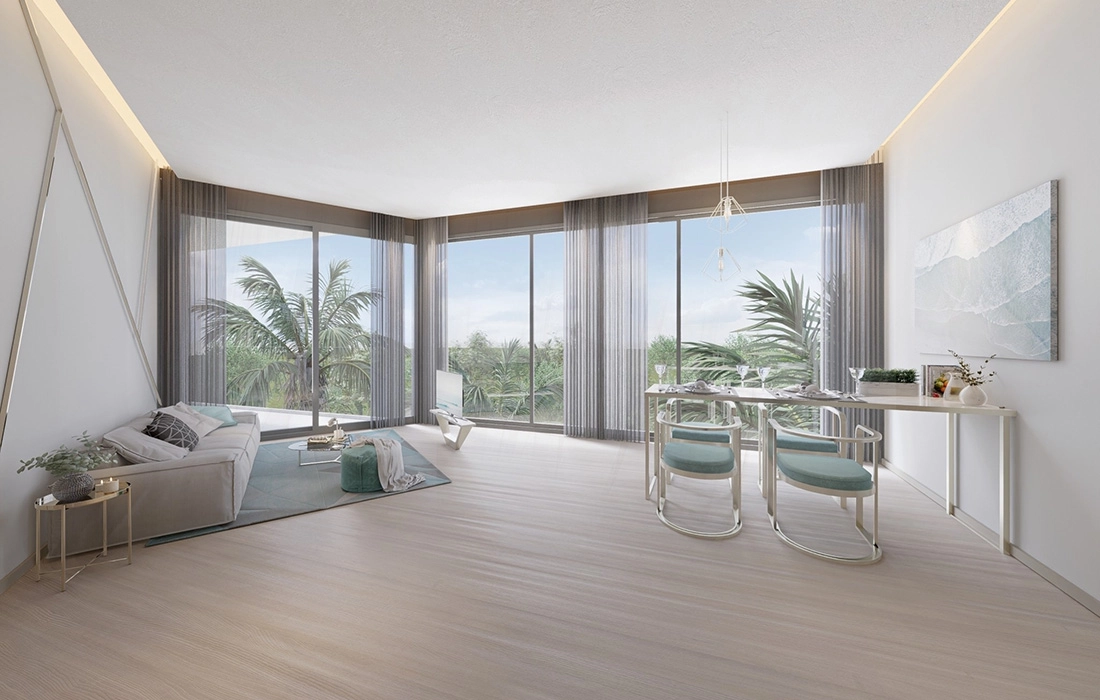 The complex consists of a single 8-story building featuring 213 residential and hotel units. The layouts range from studios to one and two-bedroom apartments, with the option to combine units to create more spacious living areas. Shared amenities include various pools, a kids' club, playgrounds, a gym, a sauna, a spa, a restaurant, and transfers to the beaches.