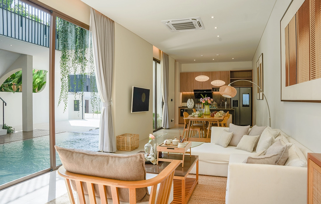 Fern Pool Villa: a three-story villa with 3 bedrooms, a spacious living room, dining area, and kitchen, as well as a private pool and rooftop garden.