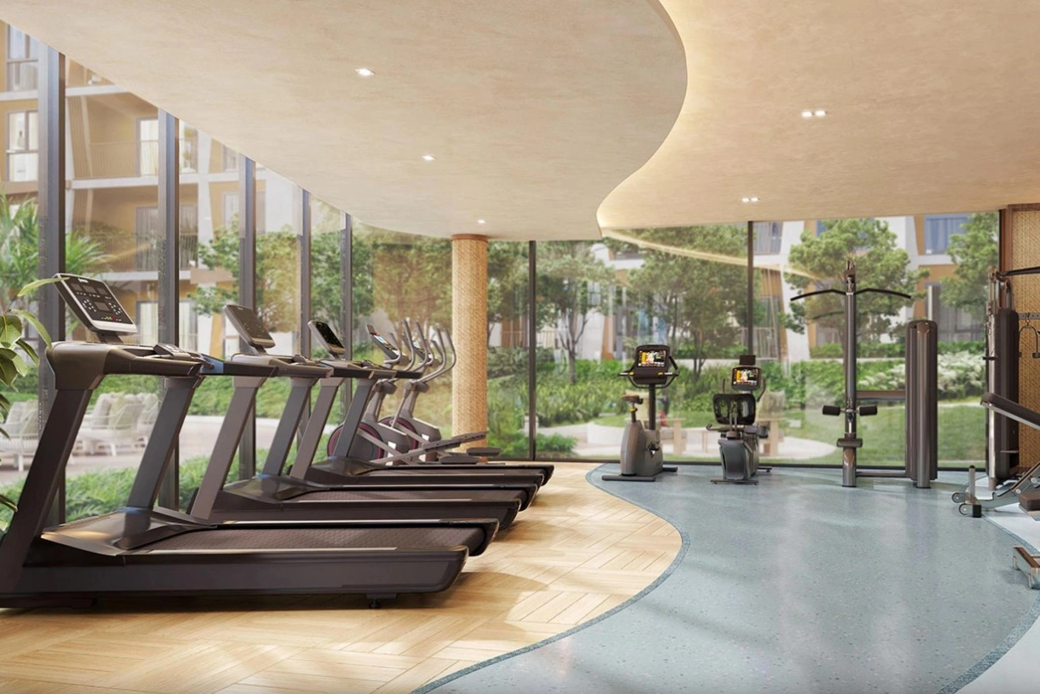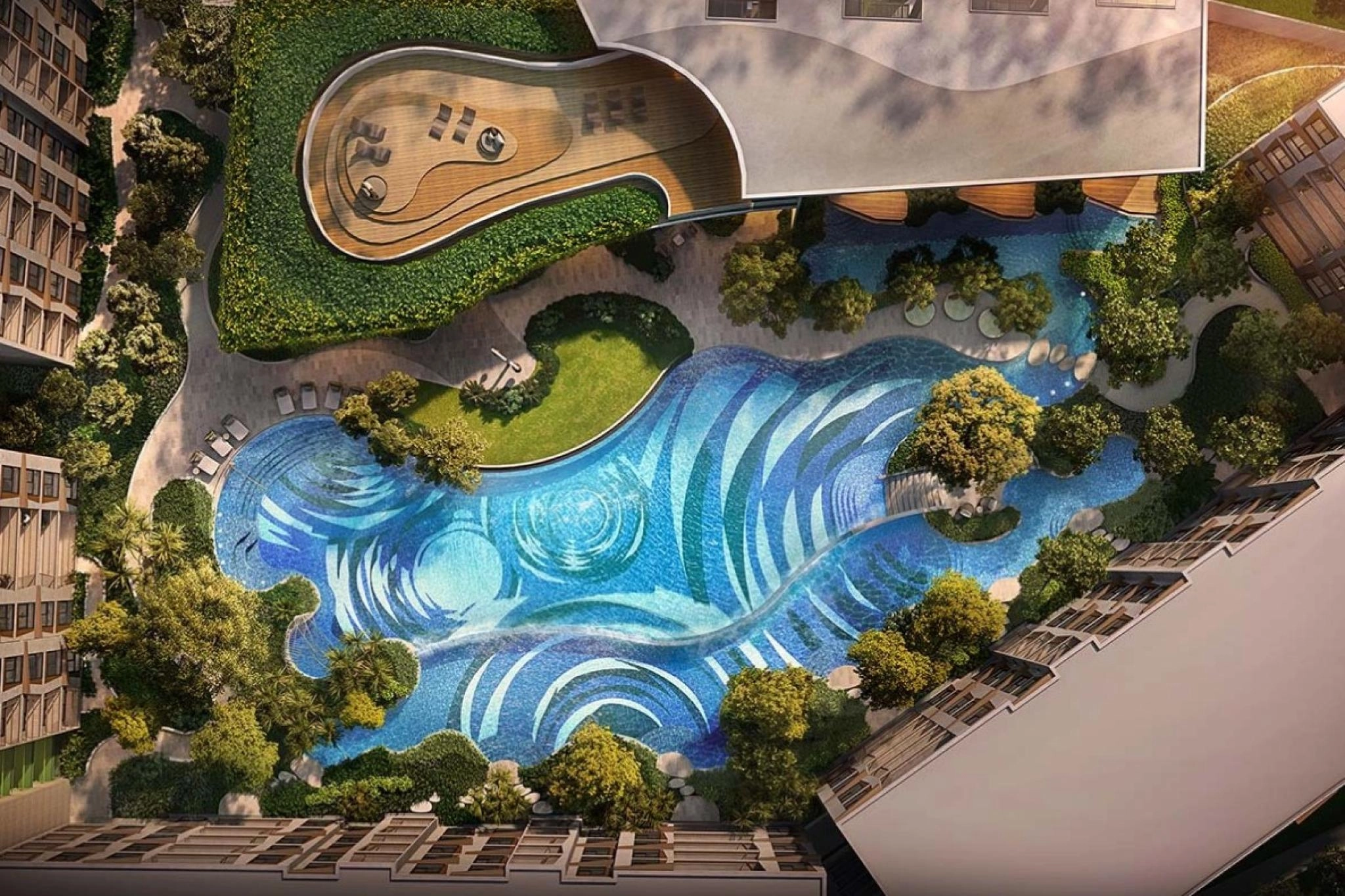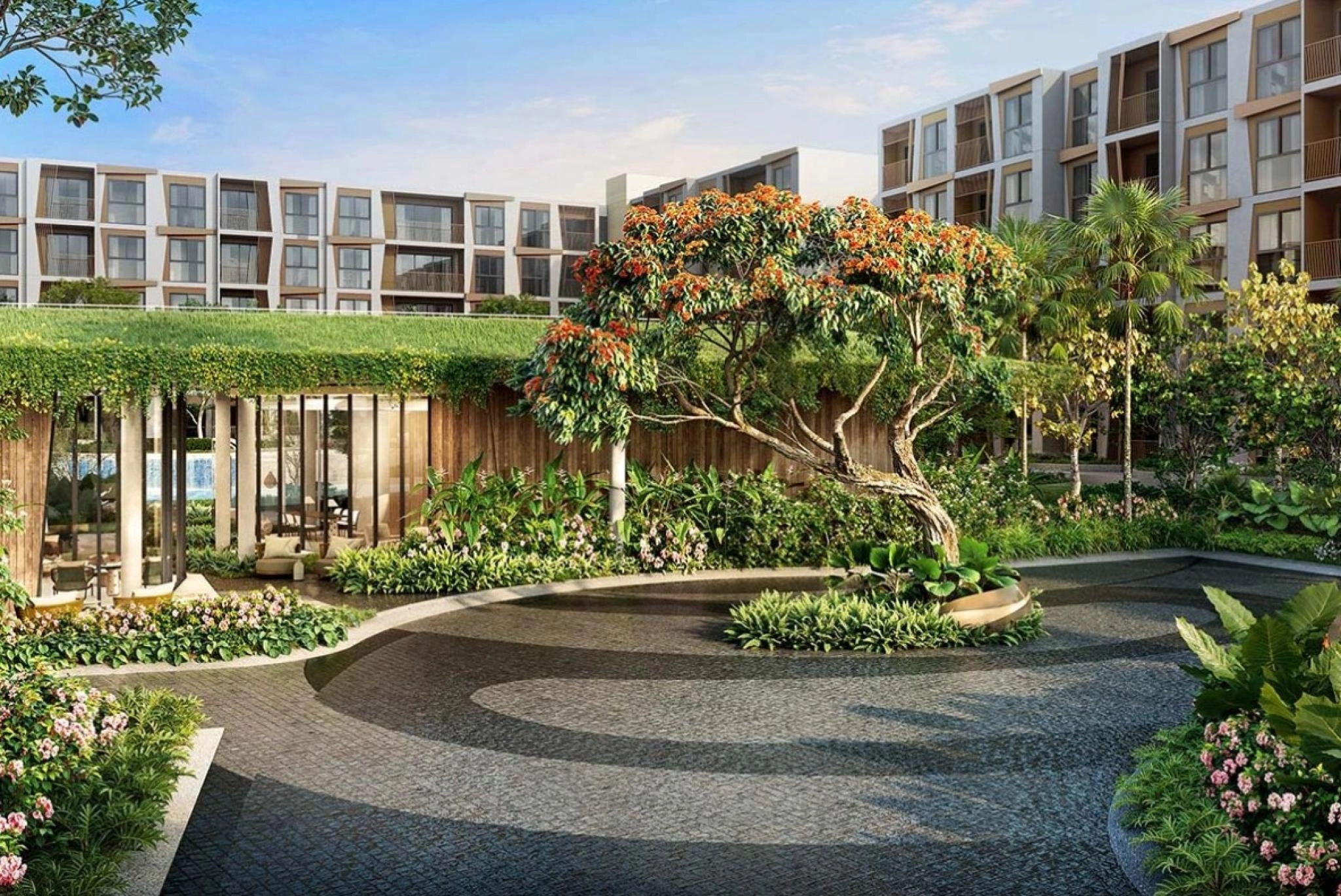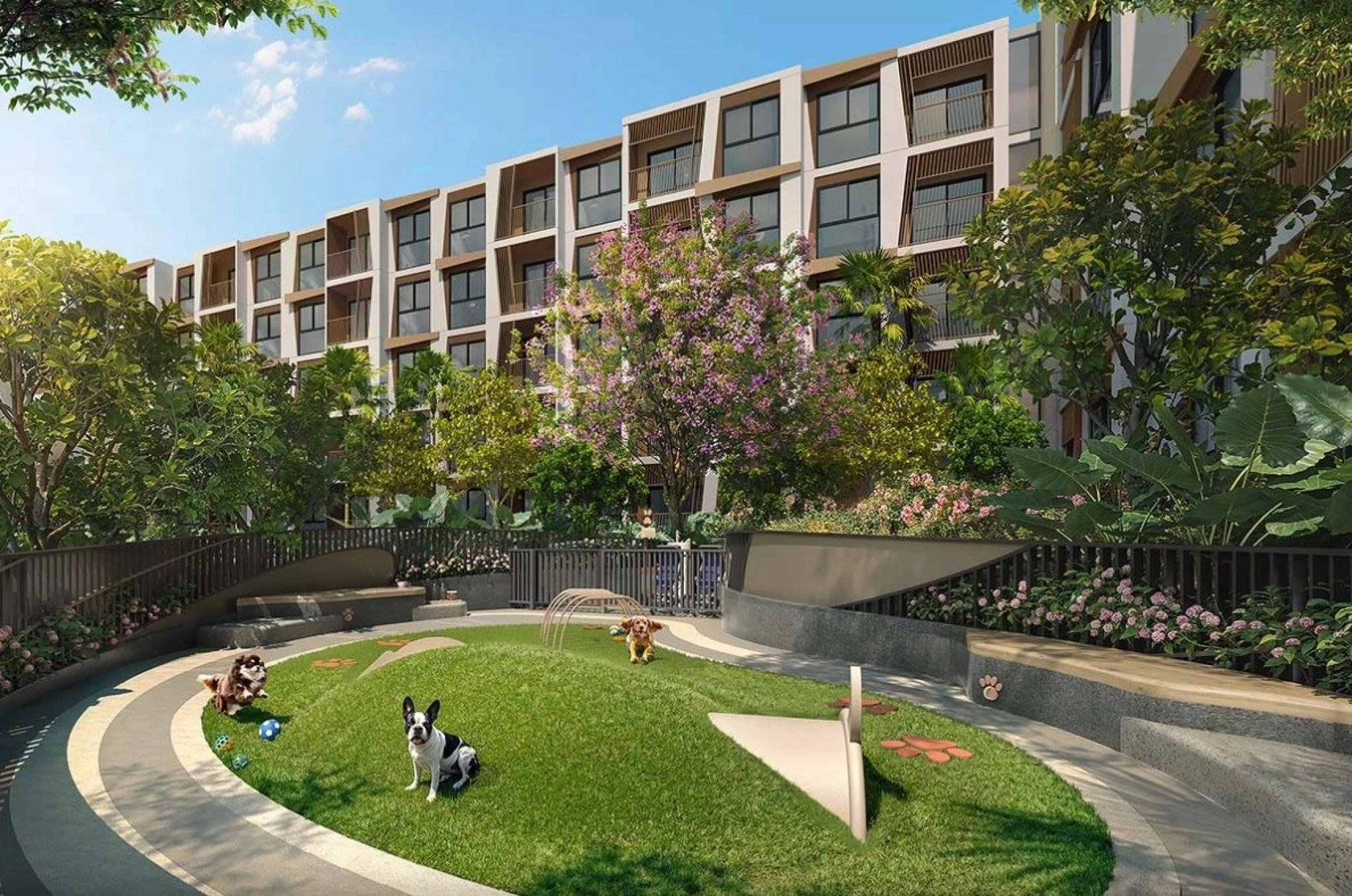 The complex occupies a plot of about 7 rai and includes 3 residential buildings of 5 stories each, totaling 295 units. The project features public areas and resort-style amenities, including a lobby, co-working space, a swimming pool, garden areas, and fitness infrastructure.