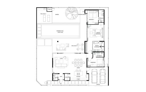 Caractéristiques : une salle de séjour et une salle à manger spacieuses à aire ouverte, une cuisine moderne entièrement équipée, de hauts plafonds, une terrasse au bord de la piscine et un garage pour 2 voitures.