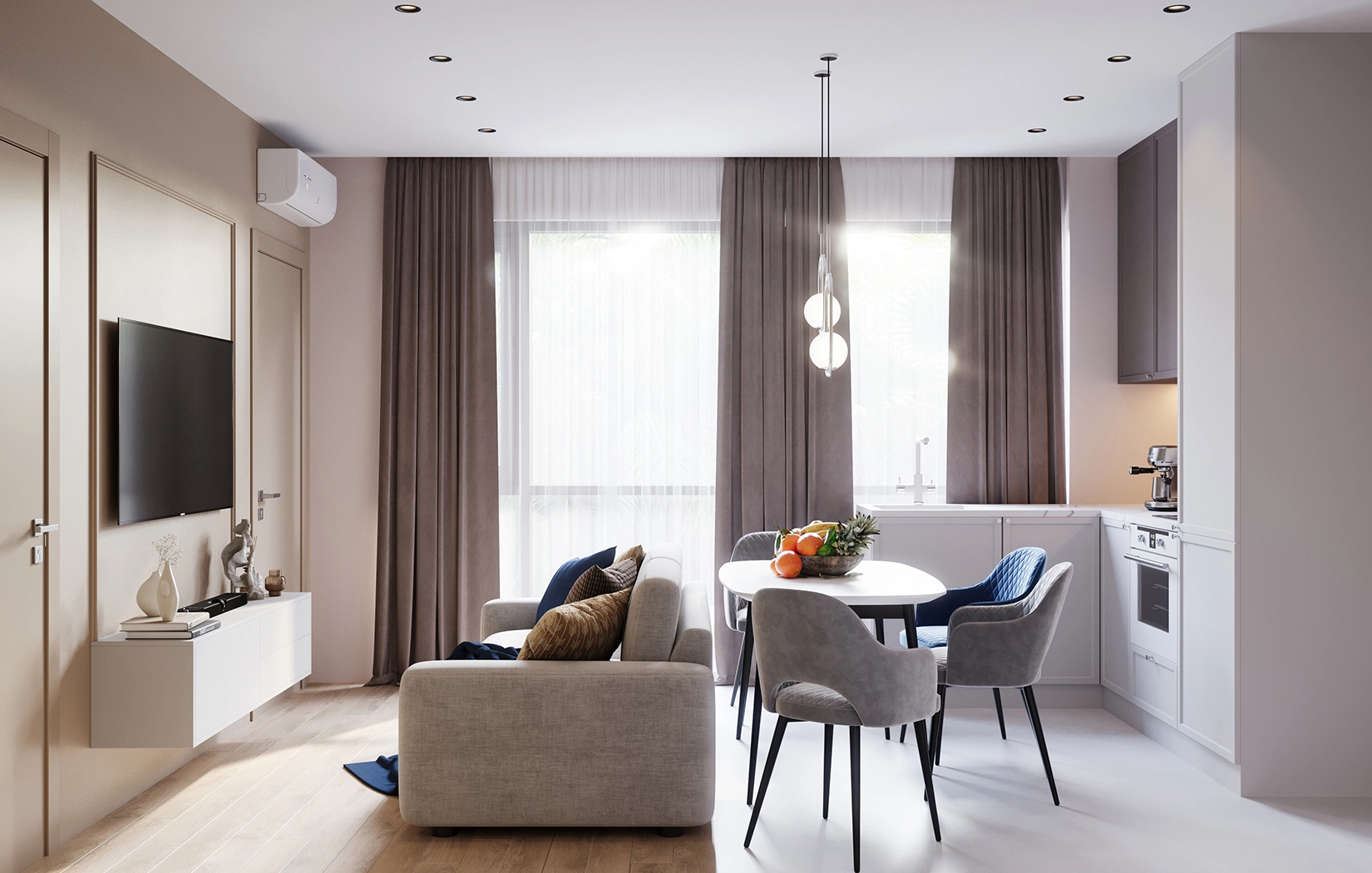 Апартаменты полностью меблированы, включая текстиль, посуду и декор. Жители первого этажа получают собственные террасы, где можно заниматься йогой, устраивать барбекю или отдыхать среди экзотических растений.